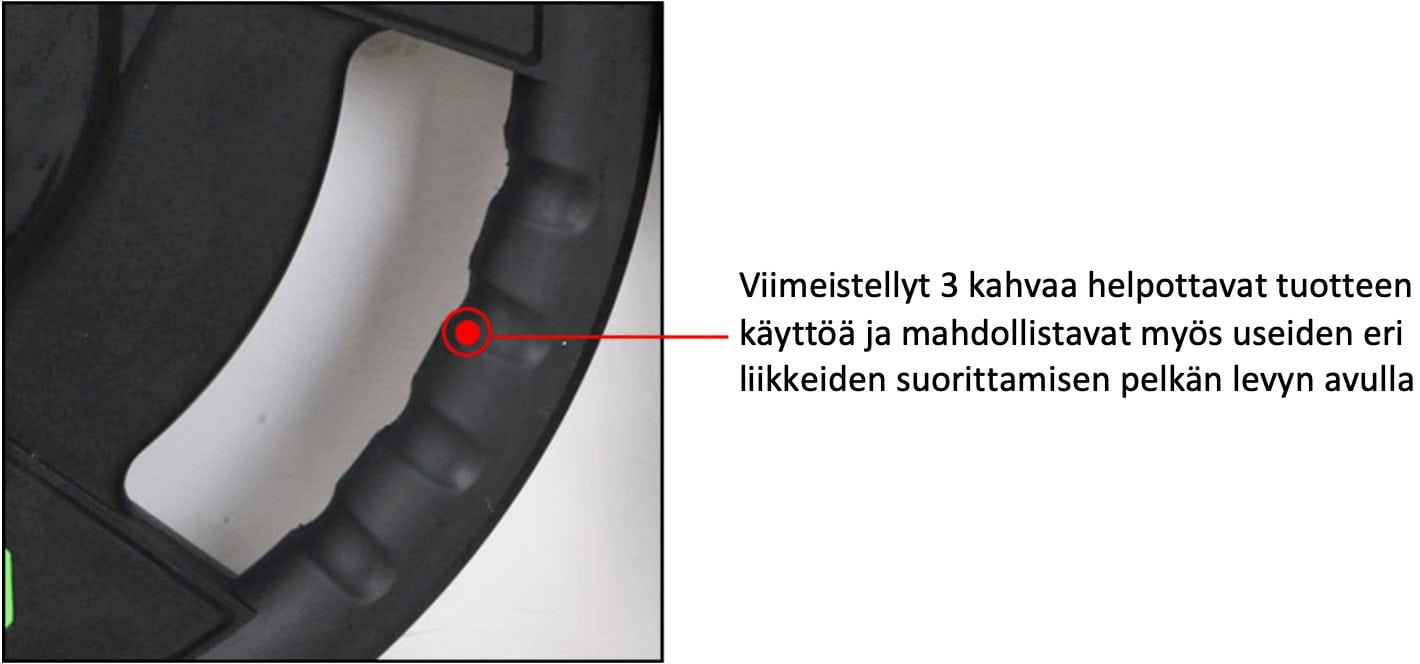 Huippuluokan viimeistelyn lisäksi levypaino on varustettu kolmella ergonomisella kahvalla lisäten käyttömukavuutta. Kahvojen ansiosta voit käyttää levyjä myös muissa ilman laitteita tai tankoja tehtävissä harjoitteissa.