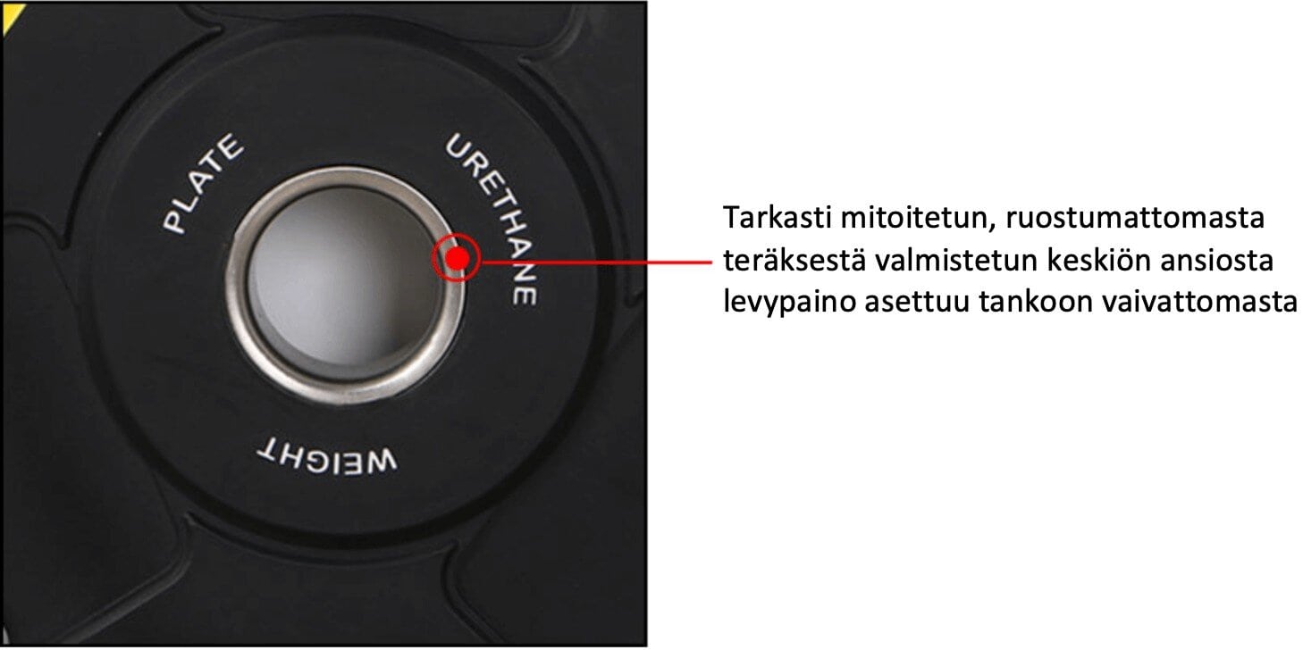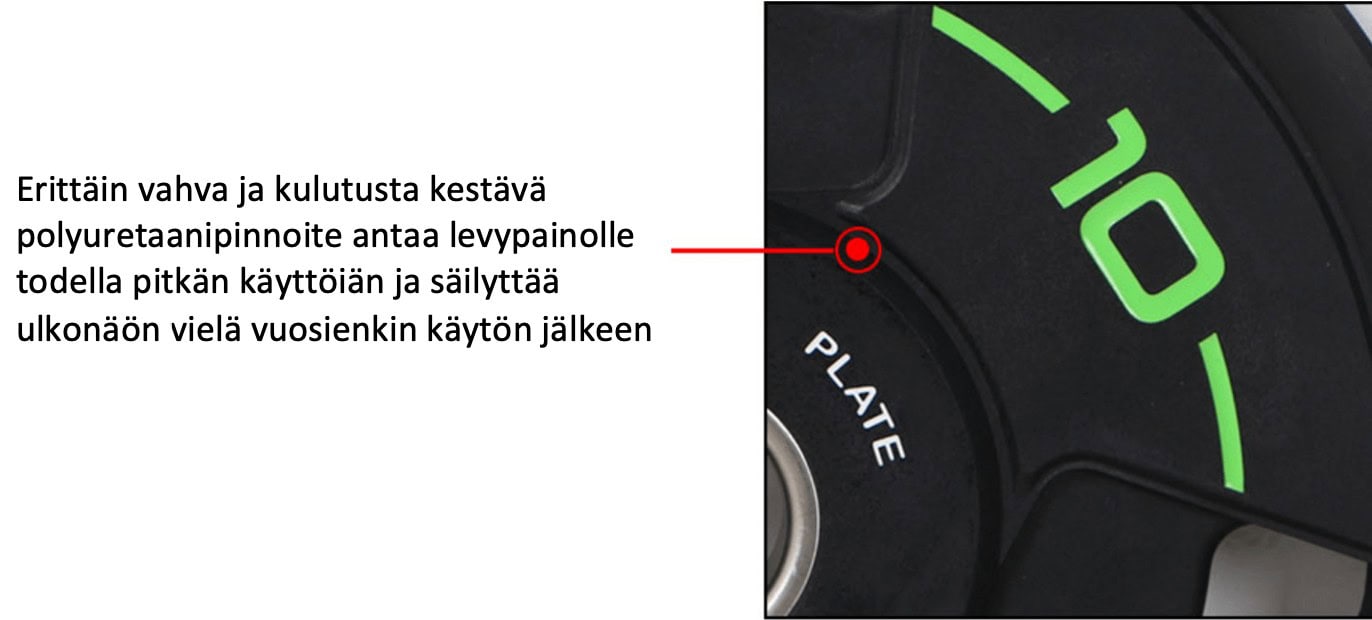 Nämä levypainot ovat varma valinta jokaiselle kuntosalille. Polyuretaani ei haise samalla tavalla kuin kumi. Polyuretaani on uusi innovatiivinen materiaali levypainoissa sen erinomaisen kestävyyden ja hajuttomuutensa ansiosta. Ne ovat erittäin tarkat (ei poikkeamaa) ja mahdollistavat korkealaatuisen voimaharjoittelun. Lisäksi niissä on suuri käyttömukavuus.